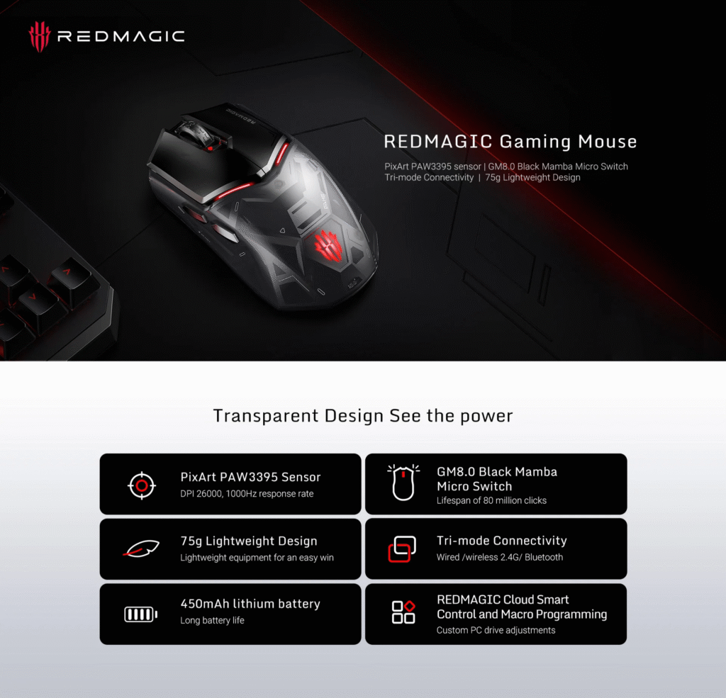 Home » Blog » Redmagic » REDMAGIC Gaming Mouse Sale REDMAGIC Gaming Mouse Sale Phones Discount CouponsRedmagic 24 GET DEAL GET DEAL PixArt PAW3395 sensor | GM8.0 Black Mamba Micro Switch | Tri-mode Connectivity | 75g Lightweight Design
